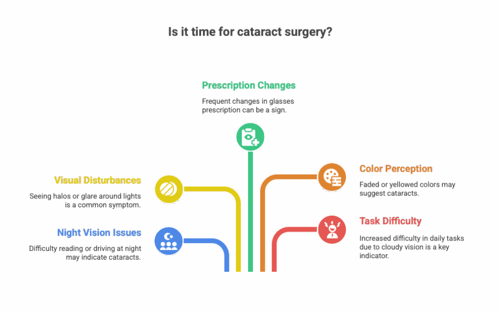 Cataract surgery is typically needed when vision problems start to affect your daily activities and cannot be corrected with glasses or contacts. Signs include trouble seeing at night, increased glare or halos, frequent changes in prescription, or difficulty with tasks like reading and driving. Your eye doctor can assess your symptoms and recommend the best time for surgery.